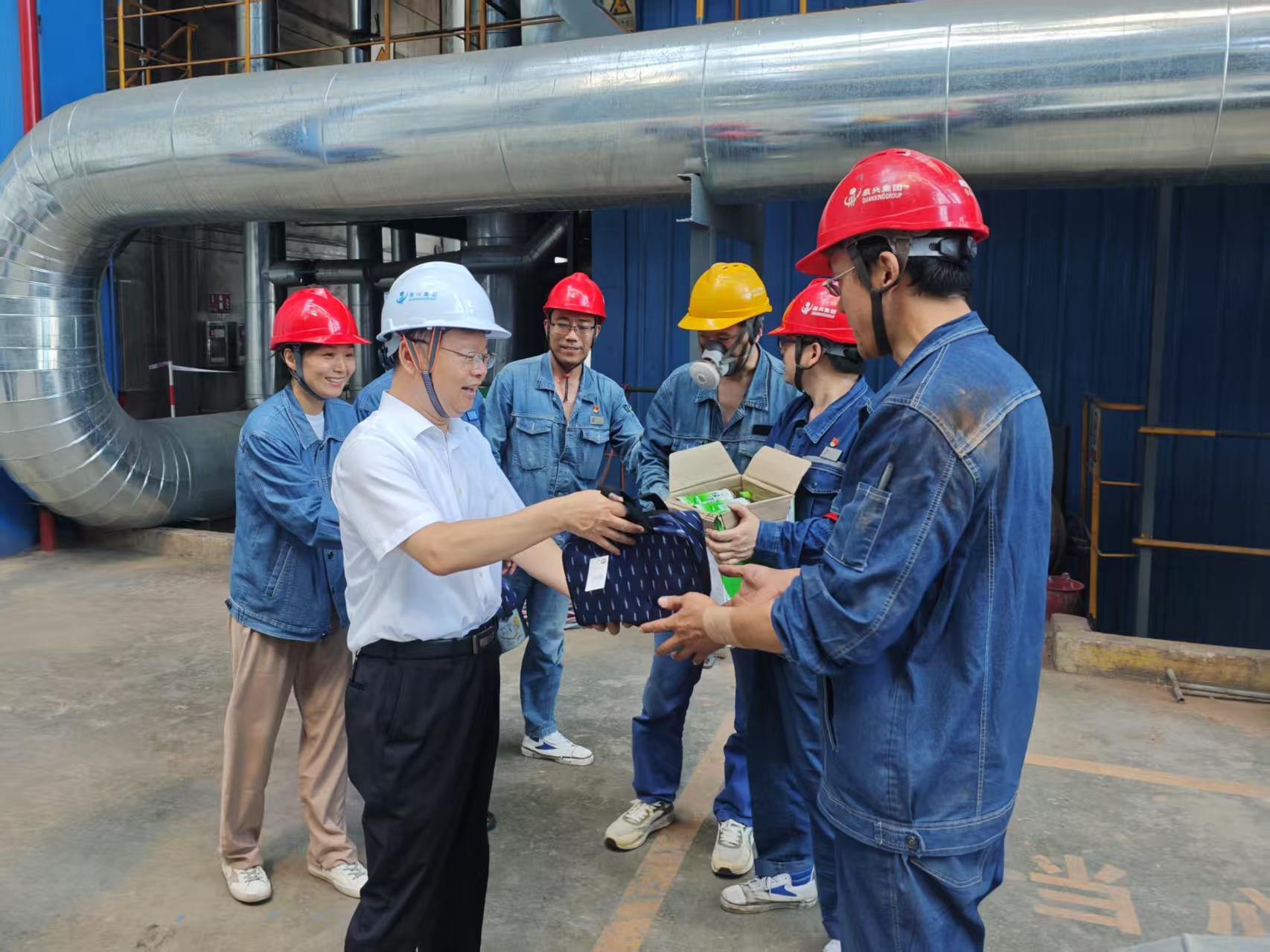 7月5日,集团党委书记、董事长张宗辉到南郊热电公司、沃丰水泥公司深入生产一线,慰问酷暑高温下坚守生产岗位的员工,为在岗人员送上防暑降温“清凉包”、纯净水、西瓜等消暑物品。集团党委委员、副总经理、工会主席王君良参加。在南郊热电公司,张宗辉强调,要严格落实安全生产责任制,做好设备巡检维护和现场风险排查,加